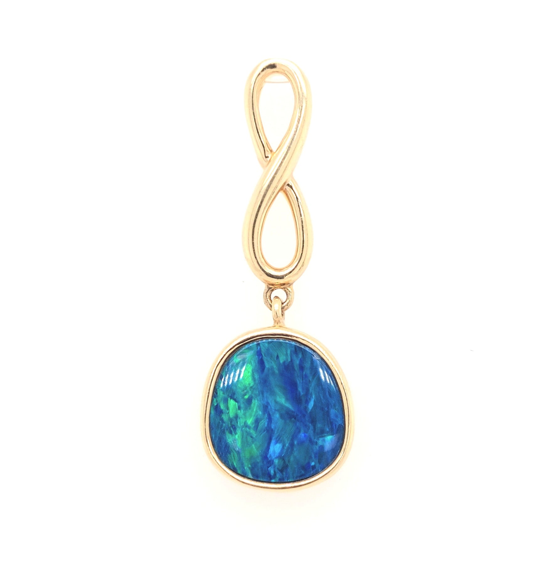 Suspended from an infinity bail, the opal seems to float weightlessly, adding a touch of elegance and sophistication to the design. The infinity symbol, with its graceful curves, symbolizes eternity and endless possibilities, making it a fitting accompaniment to the timeless beauty of the opal.
