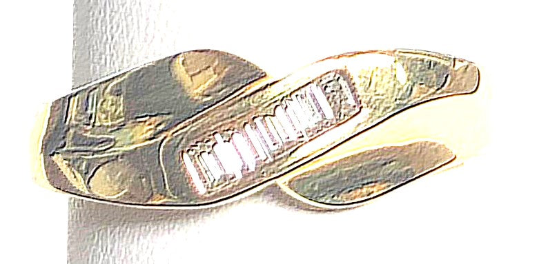 At the center of this exquisite band are striking baguette-cut diamonds, meticulously arranged in a seamless row. These diamonds are renowned for their sleek and elongated shape, which gives them a sophisticated and modern appearance. Unlike traditional round-cut diamonds, baguette diamonds have a distinctive look that adds depth and character to the band. Each diamond is carefully selected for its exceptional clarity and brilliance, ensuring a mesmerizing sparkle that captures the eye and enhances the beauty of the band.Modern Yet Timeless Design